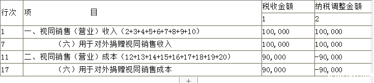 (1)企业所得税视同销售处理:调增视同销售收入100000元,调增视同销售成本90000元(含转出进项税额10000元),合计调增应纳税所得额10000元。